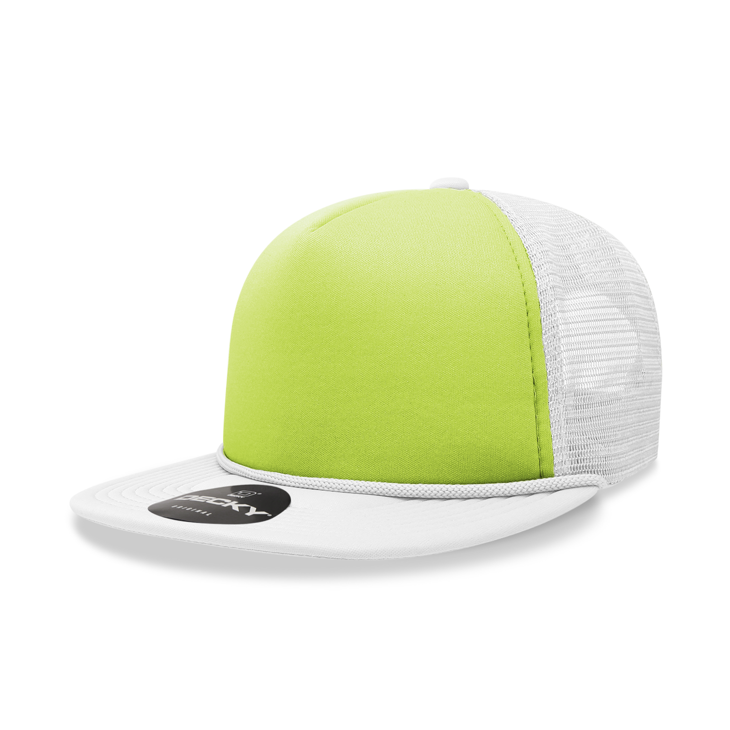 The Flat Bill Neon Trucker Cap is a constructed, 5-panel cap with a neon foam front and rear black or white mesh. It features an integrated cotton sweatband, a black or white flat bill and an adjustable plastic snap closure.