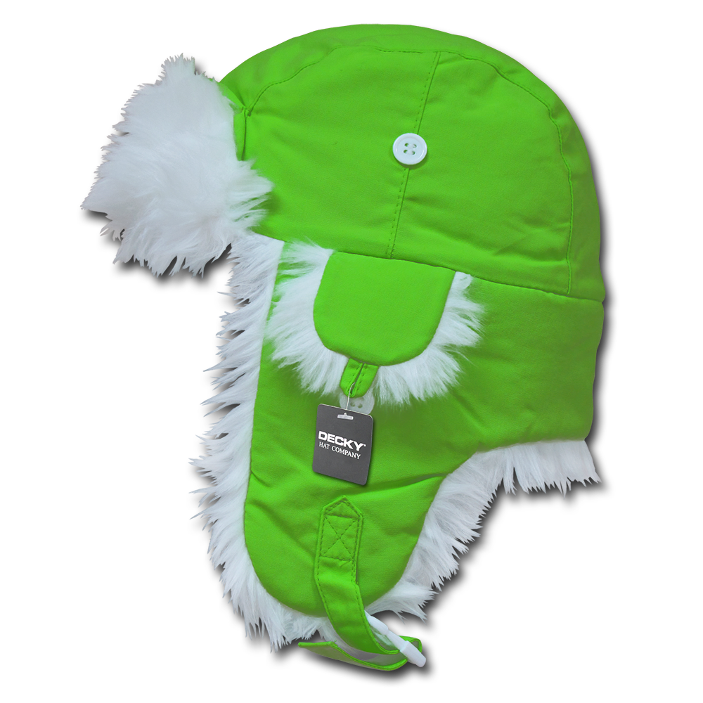 The Neon/White Fur Aviator Hat is a soft, snug-fitting hat with a neon shell and white faux fur lining. It features earflaps that can be worn up or down and a plastic buckle fastener at the chin.
